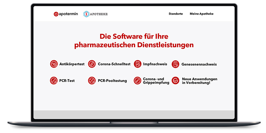 Mit apotermin managen Sie Dienstleistungen rund um Ihre Apotheke wie Medikationsmanagement (MediCheck), Impfungen oder Covid-Teststationen. apotermin ist die Termin- und Verwaltungssoftware: komplett digital, mit automatischem Dokumentenversand, Anbindung Ihrer Apotheken-Homepage und inklusive wichtiger Schnittstellen.