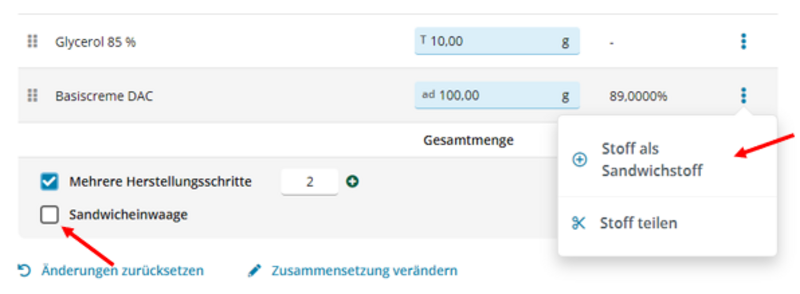 Ab sofort legen Sie in der Herstellungsanweisung fest, ob eine Rezeptur im Sandwichverfahren hergestellt werden soll. Ihre gewählte Grundlage wird dann geteilt und Sie können nach Wunsch konkrete Mengen der Sandwichteile angeben oder ein “q.s.” belassen. Der Stoff ist in der Herstellungsanweisung und im Protokoll mit einem “S” markiert.