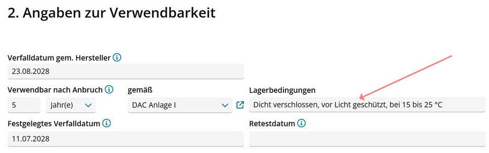 In der Ausgangsstoffprüfung werden ab sofort zu vielen Stoffen Lagerbedingungen automatisch vorgeschlagen. Diese können individuell angepasst, ergänzt oder gelöscht werden.