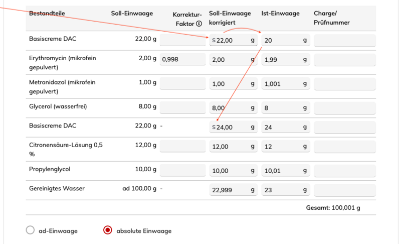 Im neuen Einwaage-Modus absolute Einwaage wird die Soll-Einwaage des ad-Bestandteils nach jeder Einwaage laufend neu berechnet.
