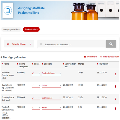 Über die praktischen Filtermöglichkeiten lassen sich individuelle Listen erstellen. So können Sie z.B. nach dem Verfallsdatum filtern um verfallene Stoffe leichter aussortieren zu können. Erstellte Filter können bei Bedarf gespeichert und wieder aufgerufen werden.