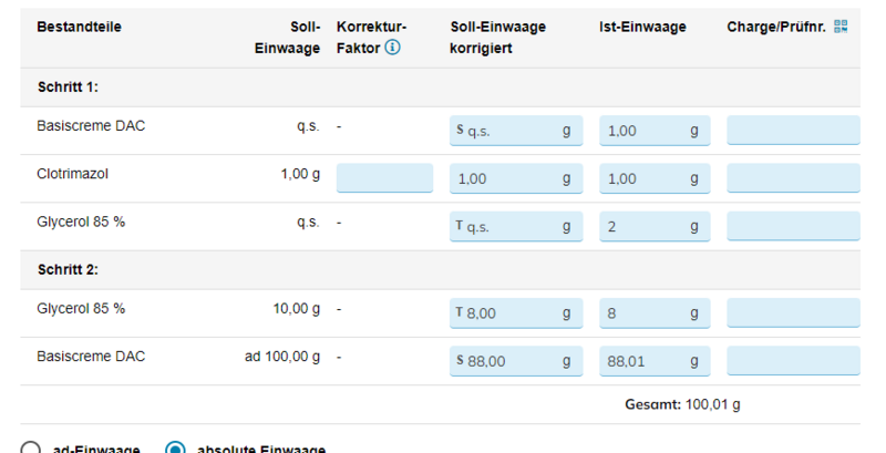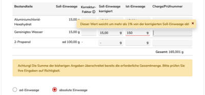 Wir haben die Einwaage-Funktionalität im Herstellungsprotokoll neu aufgebaut. Sie können dadurch Ihren Taschenrechner ab sofort bei der Rezeptur-Herstellung in der Schublade lassen.