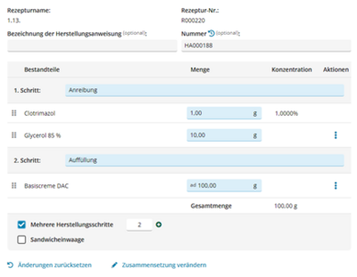 Für eine genauere Verfahrensanweisung und bessere Übersichtlichkeit kann eine Rezeptur ab sofort in beliebig viele Schritte unterteilt werden. Die Herstellungsabschnitte werden durch Verschieben der Bestandteile an die passende Stelle platziert und individuell benannt.