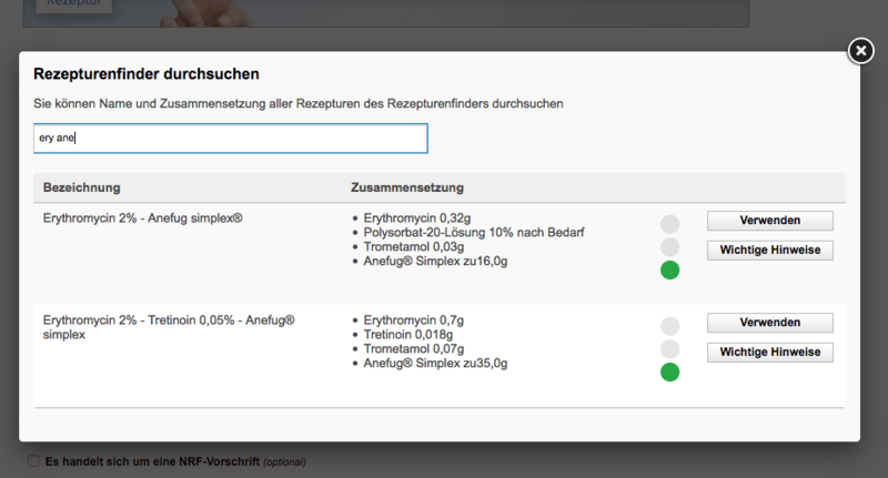Sie können ab sofort in der Eingabemaske der Rezeptur und Defektur den Rezepturenfinder des DAC/NRF durchsuchen. Dort sehen Sie die Bewertung der Rezepturen nach Ampelsystem und können die Hinweise dazu im DAC/NRF nachschlagen. Eine bequeme Übernahme der Rezepturzusammensetzung in Ihre Eingabemaske ist ebenfalls möglich.