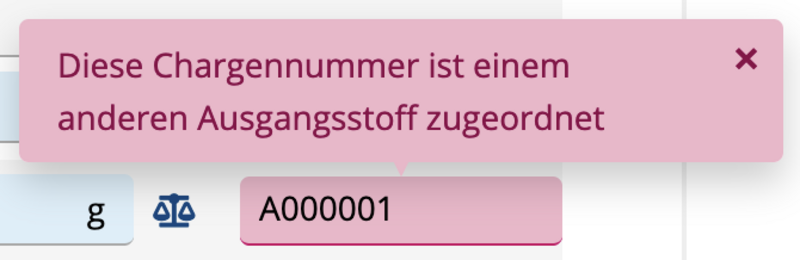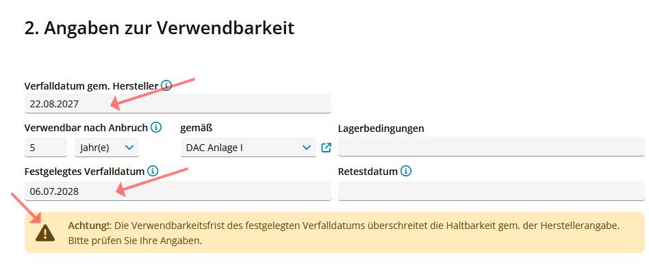 Im Abschnitt 2. der Ausgangsstoffprüfung wurde eine neue Warnmeldung eingefügt. Diese erscheint wenn das festgelegte Verfalldatum des Ausgangsstoffes weiter in der Zukunft liegt, als das vom Hersteller angegebene Verfalldatum.
