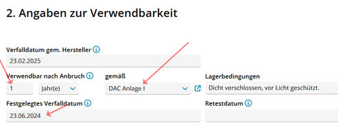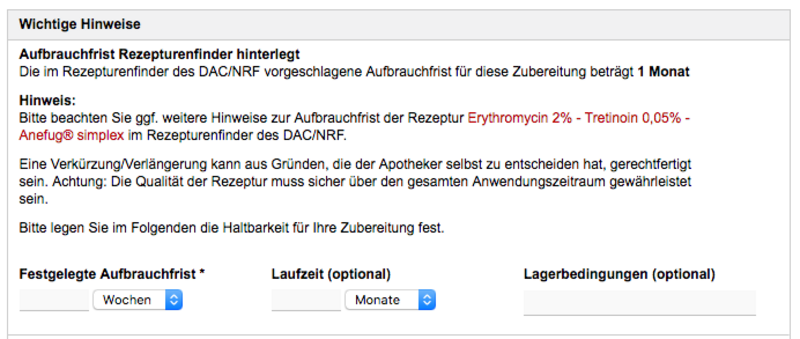 Im Bereich Plausibilitätsprüfung wurden im Abschnitt Aufbrauchfrist einige Änderungen vorgenommen. Zur Vereinheitlichung werden nun die Felder Aufbrauchfrist, Laufzeit und Lagerbedingungen immer gleich angezeigt. Hier sollten Sie die Haltbarkeit Ihrer Zubereitung festlegen.
