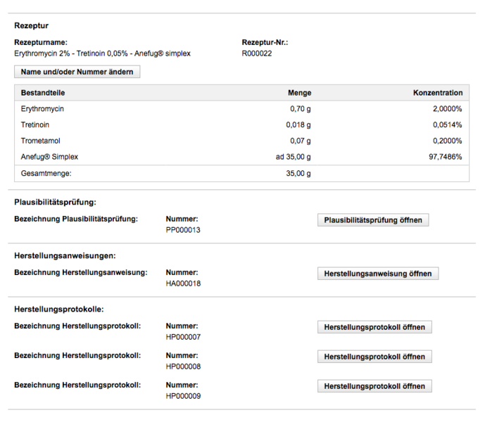 In diesen Archiven können Sie eine Rezeptur/Defektur öffnen und erhalten alle zugehörigen Dokumente aufgelistet. Bei Bedarf können Sie an dieser Stelle auch den Namen und die Nummer der Rezeptur/Defektur ändern. Ab sofort lassen sich dort ganze Rezepturen/Defekturen löschen. Achtung, es werden in Folge alle zugehörigen Dokumente gelöscht.