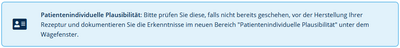 Des Weiteren können Sie sich die Angaben zur patientenindividuellen Plausibilität, welche Sie bei der ursprünglichen Rezeptur im Plausi-Ergebnis eingetragen haben, erneut im Herstellungsprotokoll anzeigen lassen. So können Sie ggf. relevante Textbausteine, welche für den aktuellen Patienten ebenfalls zutreffen, durch Kopieren übernehmen.