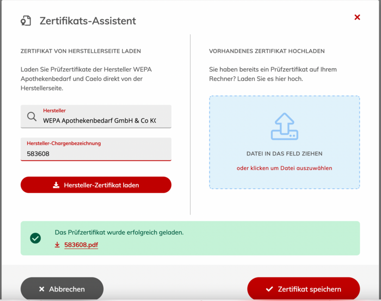 Über den neuen Zertifikats-Assistenten können Prüfzertifikate direkt vom Hersteller geladen werden. Herstellername und Chargenbezeichnung werden automatisch aus dem Prüfprotokoll übernommen, so dass ein Knopfdruck ausreicht um das Zertifikat in das Protokoll einzubinden.