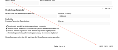 Dokumentenbezeichnungen bei Erstellung von PDFs wurden vereinheitlicht. Im Bereich der FAM- und Medizinprodukteprüfung wurden die PZNs in die Bezeichnung aufgenommen, in der Ausgangsstoff- und Packmittelprüfung die int. Chargenbezeichnung. Im Bereich Rezeptur und Defektur die Dokumentennummer.
