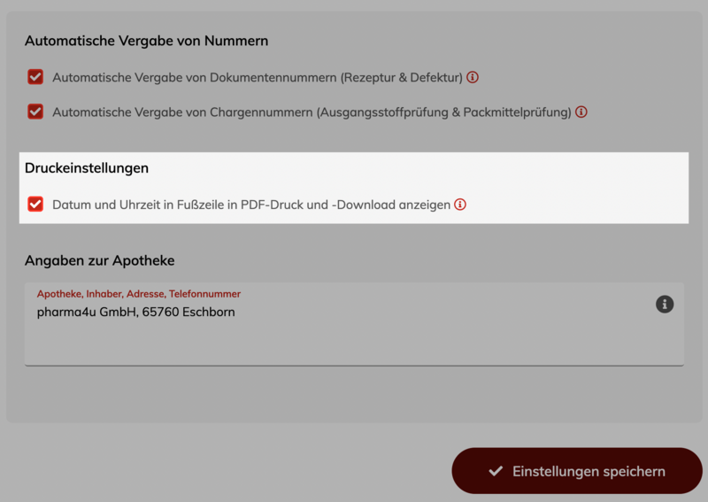 Außerdem können Sie im unteren Bereich der Einstellungen hinterlegen, welche Angaben zu Ihrer Apotheke auf den Rezepturetiketten aufgedruckt werden sollen.
