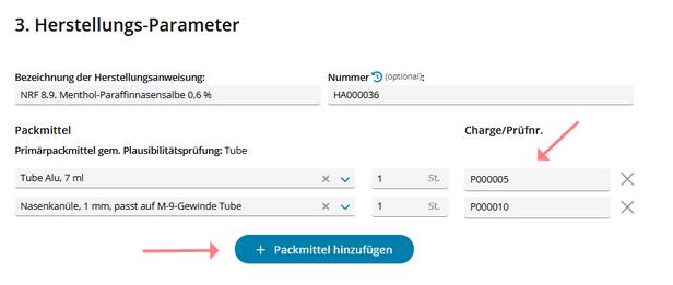 Ab sofort können im Herstellungsprotokoll von Rezeptur und Defektur die verwendeten Packmittel ausgewählt werden. Auch Zubehör wie z.B. Nasenkanülen kann ergänzt werden. Wurde das Packmittel mit LabXpert geprüft, kann die Chargennummer nach Klick in das Feld automatisch übernommen werden. Ein manuelles Eintragen der Chargenbezeichnung bleibt aber weiterhin möglich.