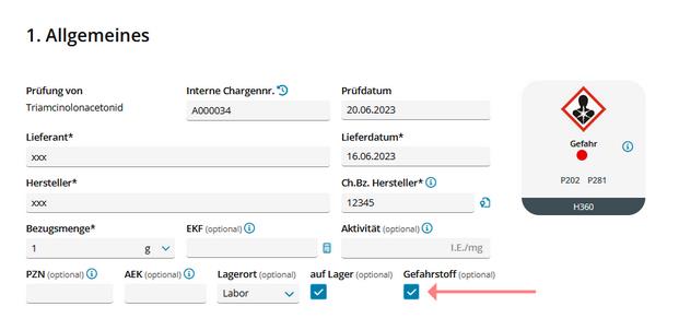 In der Ausgangsstoffprüfung können Sie künftig Ihre Stoffe als Gefahrstoff kennzeichnen. Dies geschieht automatisch, sofern uns Gefahrstoffdaten vorliegen.