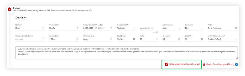 Ab sofort haben Sie die Möglichkeit, sämtliche Labor- und Vitalwerte in Schritt 4 “Labor- / Vitalwerte” zu hinterlegen und hier die GFR zu berechnen.