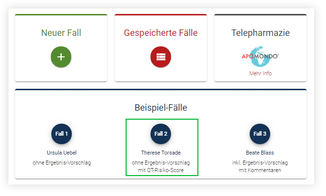 Auf der MediCheck-Startseite wurde exemplarisch für die Berechnung des QT-Risikoscores der Beispiel-Fall “Therese Torsade” eingefügt.