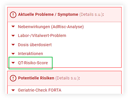 Ob QT-Zeit beeinflussende Arzneimittel in der Medikation vorhanden sind, wird Ihnen bereits in der Übersicht des Analyseergebnisses angezeigt.