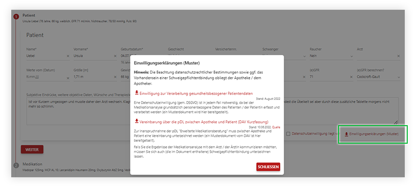 Ab sofort finden Sie im Bereich der Arbeitshilfen unter „III. MediCheck-Dokumente” sowohl ein Muster für eine Einwilligungserklärung zur Durchführung einer Medikationsanalyse als auch die von der ABDA zur Verfügung gestellte PDF-Datei über die „Vereinbarung über die pDL zwischen Apotheke und Patient”.