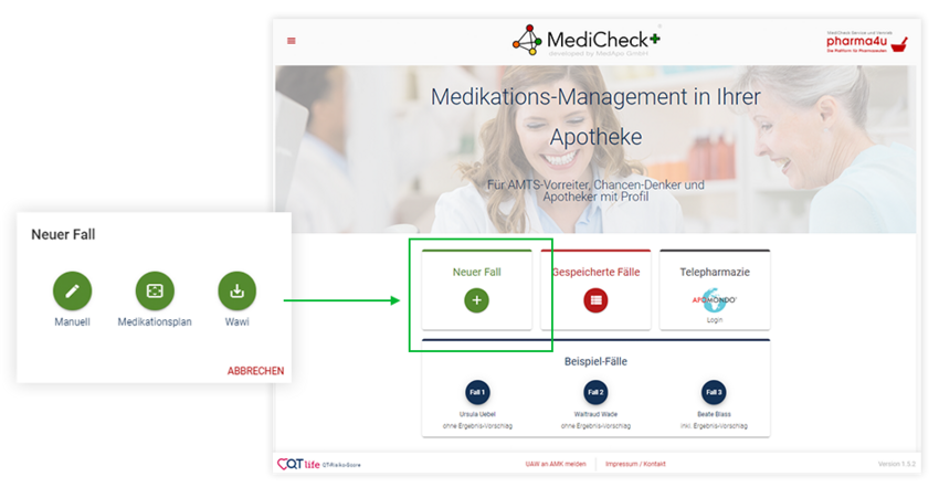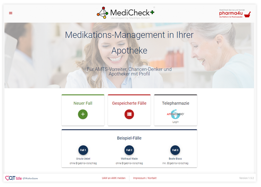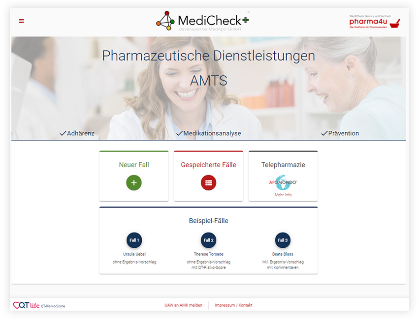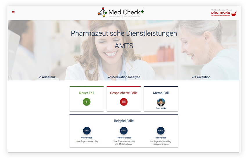 Der MediCheck unterstützt Sie in allen drei Bereichen der pharmazeutischen Dienstleistungen: Adhärenz, Prävention und Medikationsanalyse. Dies spiegelt nun auch die aktualisierte Ansicht der Startseite wider.