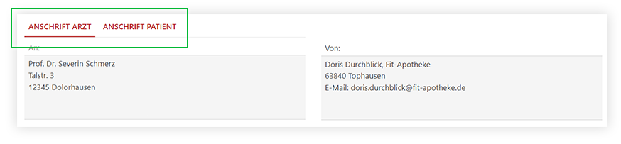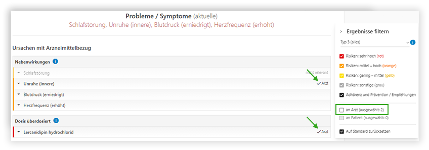 Der Ergebnisfilter gibt Auskunft über die Anzahl der Ergebnisse, die für das PDF „an Arzt” bzw. „an Patient” ausgewählt wurden.