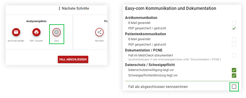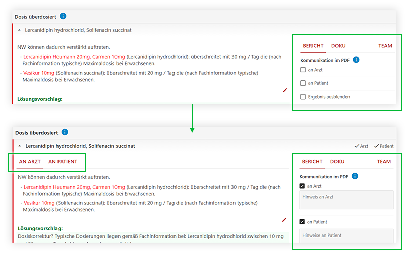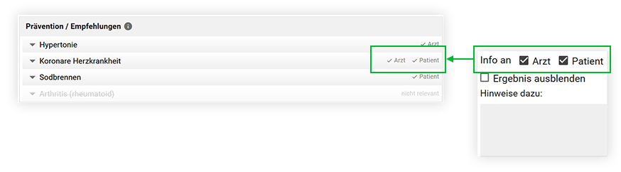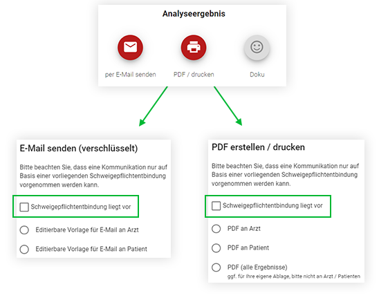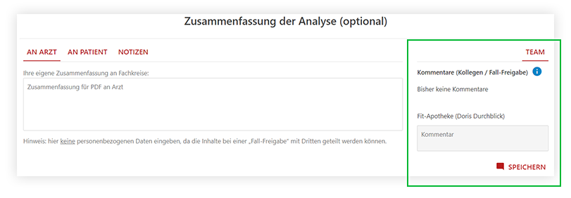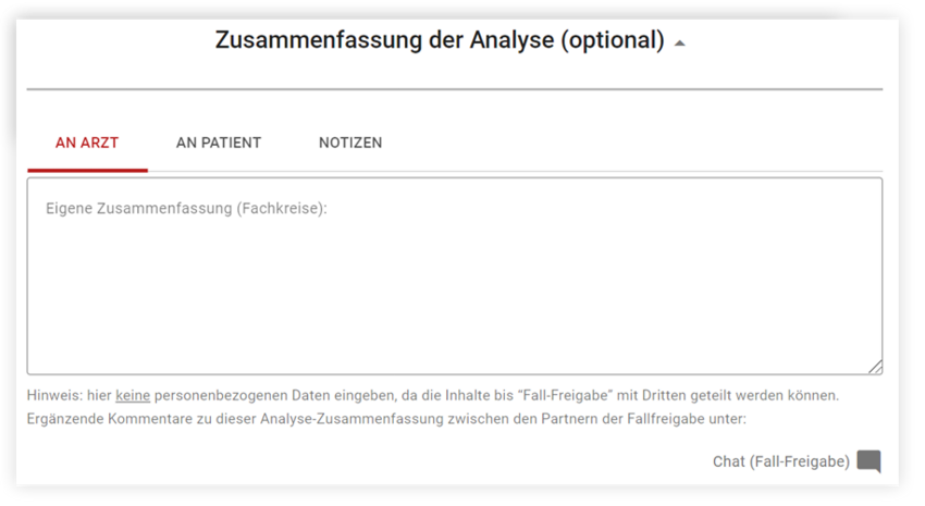 Am Ende des Analyseergebnisses haben Sie nun die Möglichkeit, Ihre priorisierten Ergebnisse für den Arzt, Patienten oder einfach Ihre eigenen Notizen optional einzutragen. Die Zusammenfassung wird anschließend gemäß Ihrer Auswahl in das entsprechende PDF übernommen.
