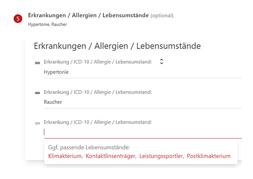 Ab sofort haben Sie im MediCheck die Möglichkeit, unter Schritt 5 „Erkrankungen / Allergien / Lebensumstände” die Lebensumstände der Patient*innen zu hinterlegen. Der MediCheck zieht Informationen aus Schritt1 „Patient” heran, um Ihnen bei Anklicken der Zeile automatisiert entsprechende Lebensumstände vorzuschlagen. Sie haben aber auch die Möglichkeit, nach weiteren Lebensumständen zu suchen und diese manuell auszuwählen.