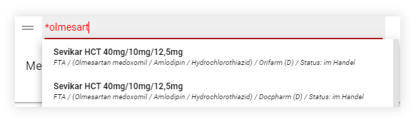 Für die Wirkstoffsuche geben Sie in der Medikationstabelle in Schritt 2 vor dem Wirkstoffnamen ein Sternchen * ein. Sämtliche FAM, die den eingetragenen Wirkstoff enthalten, werden Ihnen vorgeschlagen.