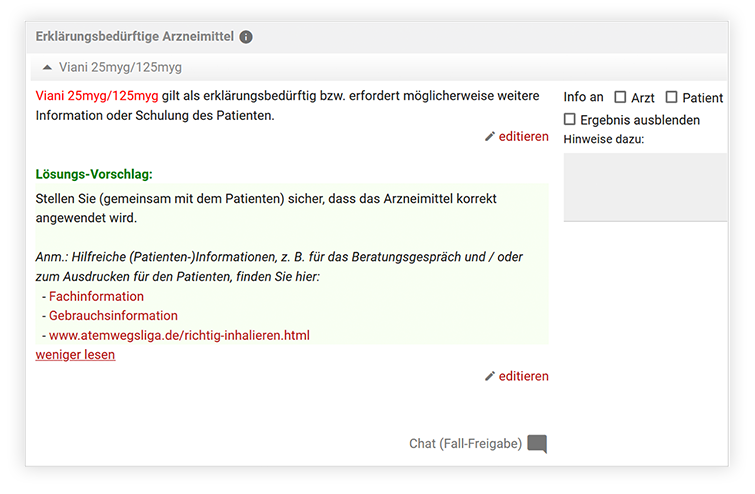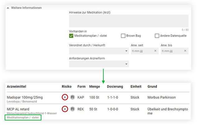 Rezepturbestandteilen und Nahrungsergänzungsmittel werden im Analyseergebnis analog zu den Fertigarzneimitteln im Bereich der Medikation angezeigt.