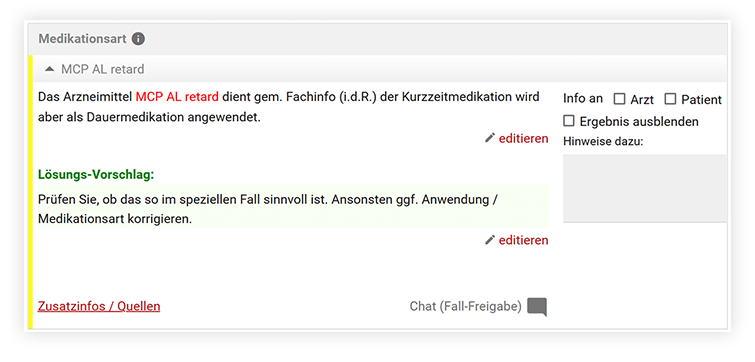 Details zu den QT-Zeit beeinflussenden Arzneimitteln und Faktoren erhalten Sie analog zu den anderen Check-Ergebnissen in der Detailansicht des Analyseergebnisses.