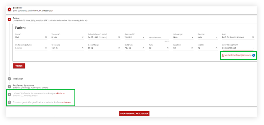 Mit den neuesten Anpassungen wurden die Patientenangaben und die “wichtigen Labor- und Vitalwerte” in Schritt 1 voneinander getrennt.