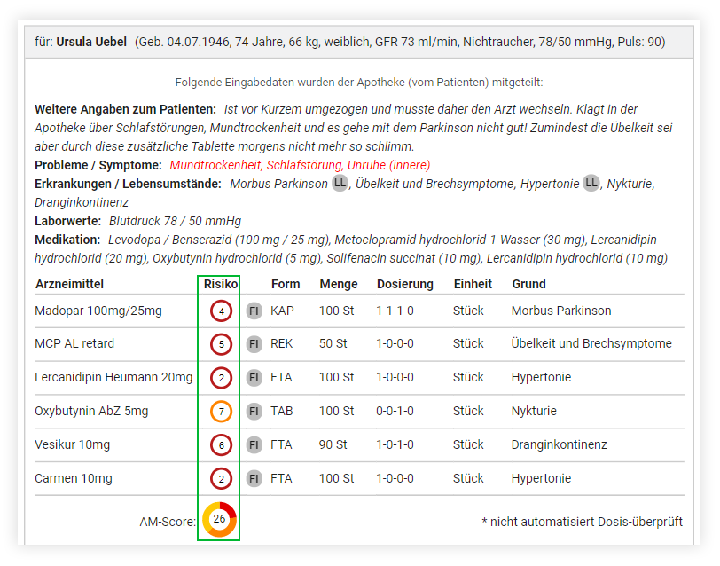 Im Ausgabe-Ergebnis wird Ihnen außerdem der AM-Risiko-Score für jedes einzelne Arzneimittel angezeigt. Dieser Score gibt Ihnen Auskunft über die Anzahl der Check-Treffer und die Farbe des höchsten Risikos des jeweiligen Arzneimittels.