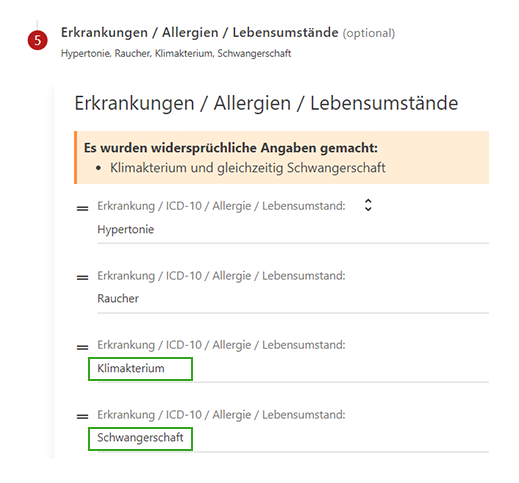 Bei widersprüchlichen Angaben erscheint ein Hinweis: