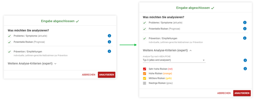 Nach abgeschlossener Eingabe und Betätigen des “Speichern und Analysieren”-Buttons wird ein aktualisierter Analyse-Dialog angezeigt. Unter "Weitere Analyse-Kriterien (expert)" ist nun die Auswahl des Analyse-Typs an dieser Stelle möglich.