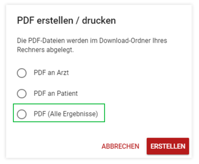 Auf vielfachen Kundenwunsch hin besteht nun zusätzlich zum PDF mit ausgewählten Check-Ergebnissen an den Arzt / Patienten die Möglichkeit, ein PDF mit allen Check-Ergebnissen z.B. für die eigene Ablage zu erstellen.