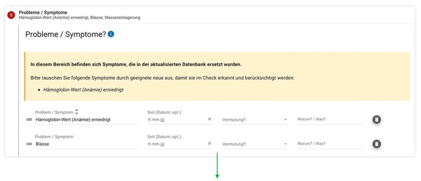 Hier ein Beispiel zum Austausch bestimmter Begrifflichkeiten gemäß ABDADatenbank² auf der Eingabeseite im Bereich Probleme / Symptome.