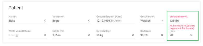 - auf der Eingabeseite z. B. bei Blutdruck- und Pulsangaben und der Angabe der Versichertennummer für Privatversicherte