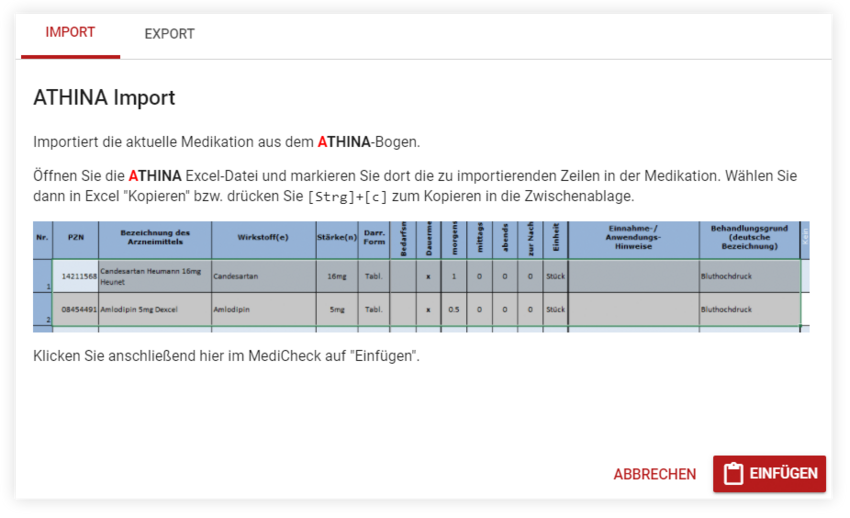 Die Medikationsangaben können aus dem ATHINA-Excel-Bogen in den MediCheck übernommen werden.