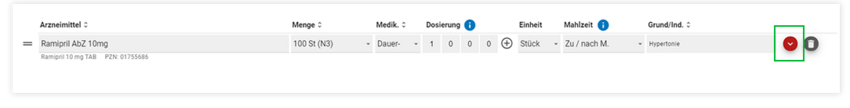 Im Bereich Medikation (Schritt 2) wurde der Bearbeitungsstift für "weitere / abweichende Angaben" durch ein Pfeilsymbol ersetzt.