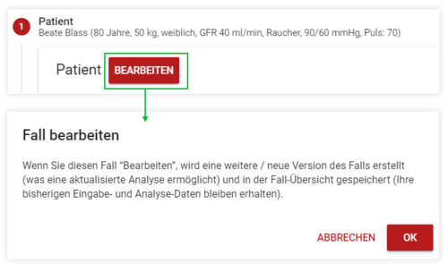 Durch das Anklicken des “Bearbeiten”-Buttons wird dieser Fall als neuer Fall angelegt. Die Eingabemaske ist entsperrt und steht damit für die Bearbeitung zur Verfügung. Bereits durchgeführte Analysen bleiben unverändert bestehen.