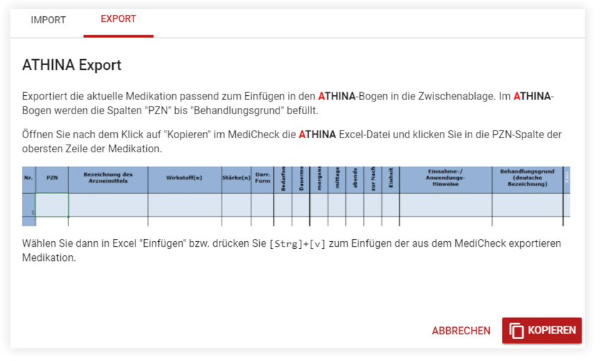 Ebenfalls können die Medikationsangaben aus dem MediCheck in den ATHINA-Excel-Bogen übernommen werden.